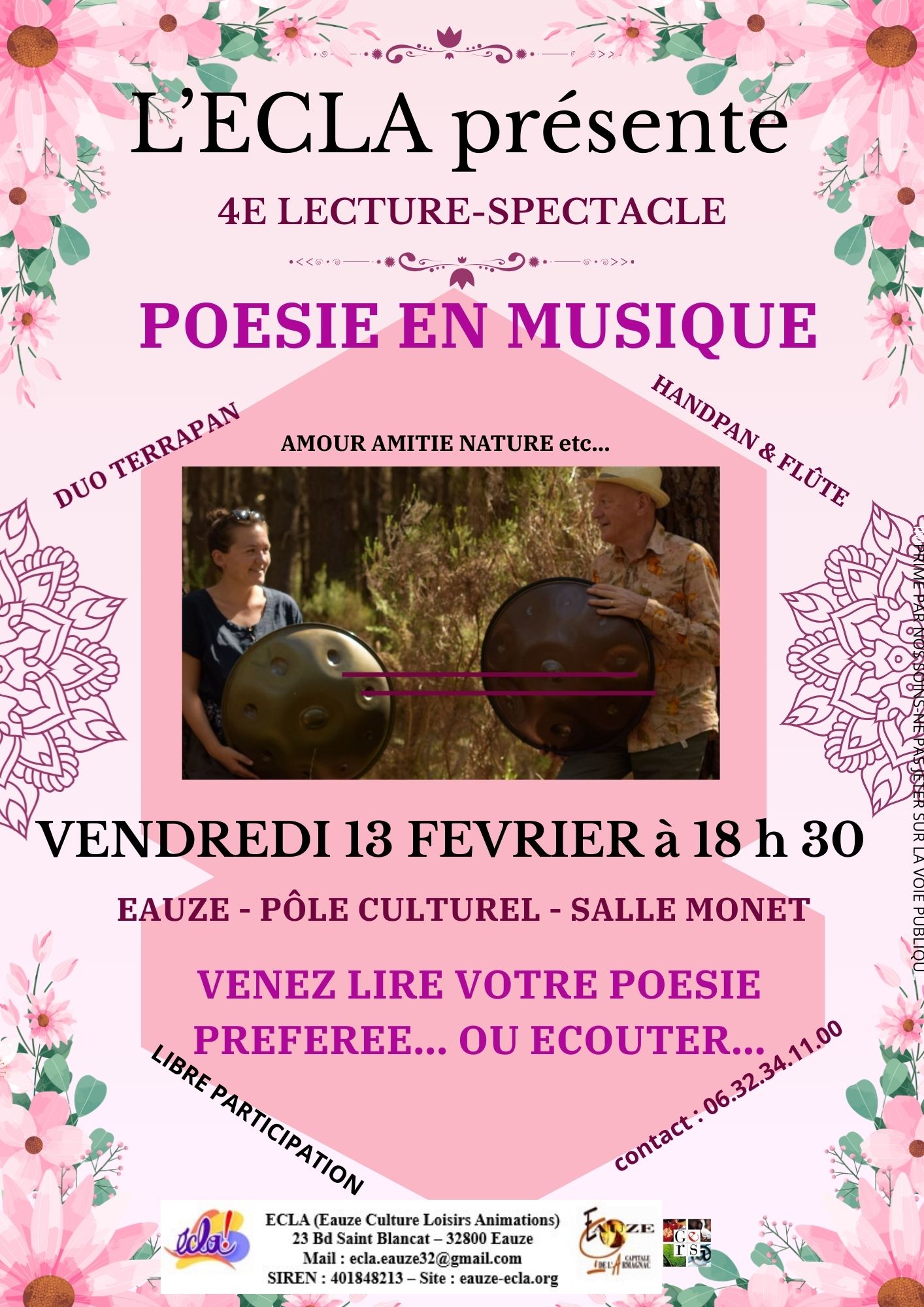 POLE CULTUREL - EAUZE 32800 23 BD ST BLANCAT, 32800 EAUZE, FrancePour la 4e fois nous organisons une LECTURE-SPECTACLE en musique avec lecture de poésies sur l'amour, toutes les sortes d'amour... Depuis des textes écrits par des femmes et des Troubadours jusqu'à nos jours... Vous pouvez venir lire votre poème préféré sur un fond musical doux et inspirant grâce au DUO Lire la suite