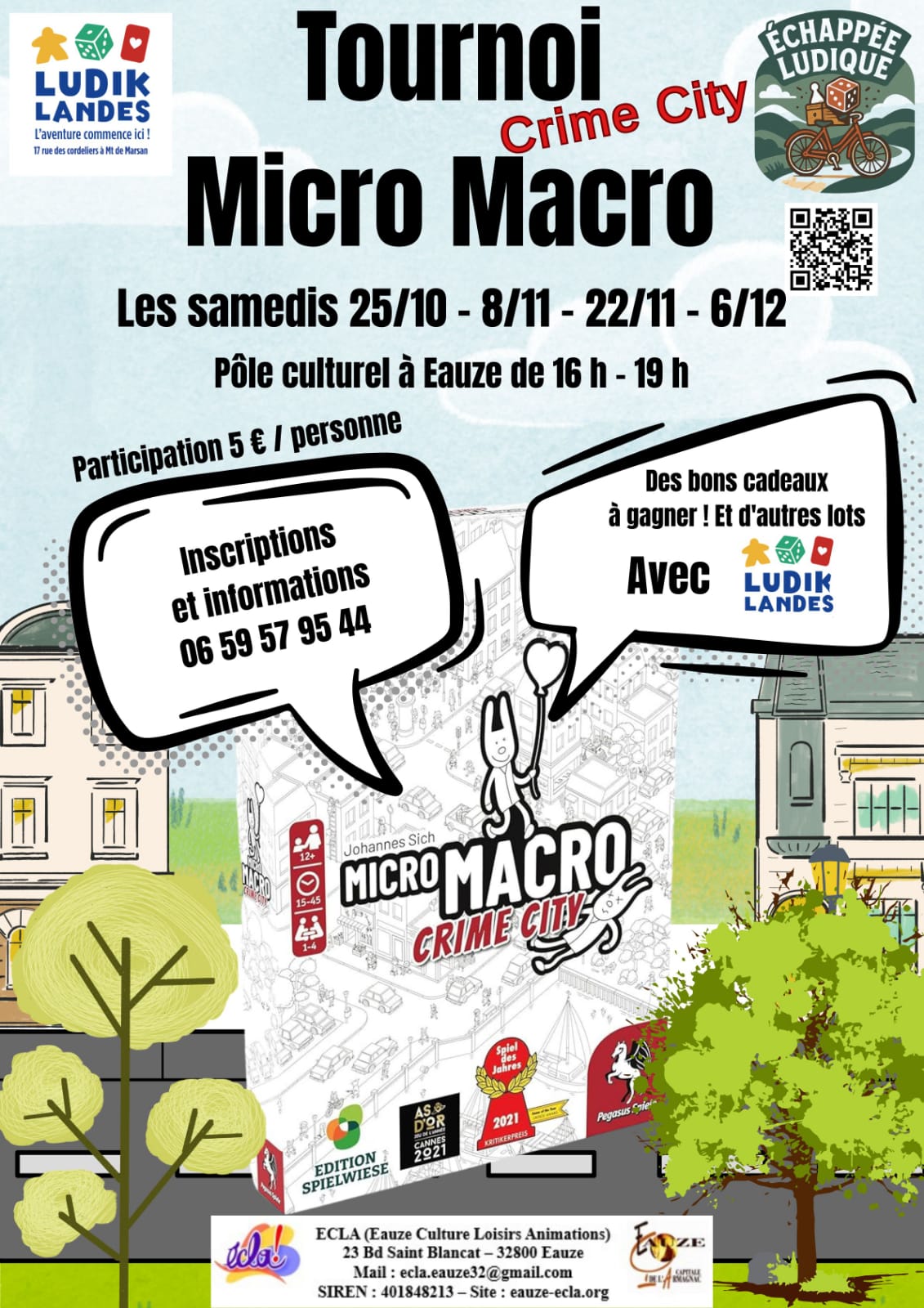 POLE CULTUREL - EAUZE 32800 23 BD ST BLANCAT, 32800 EAUZE, FranceTOURNOI JEUX DE SOCIETE DE L'E.C.L.A. au Pôle Culturel - 23 bd St Blancat à Eauze. Il se déroulera du 11 octobre au 6 décembre avec des lots de notre partenaire LUDIK LANDES... Venez nombreux pour le jeu CRIME CITY.... Familles et jeunes Tél : 06.59.57.95.44
